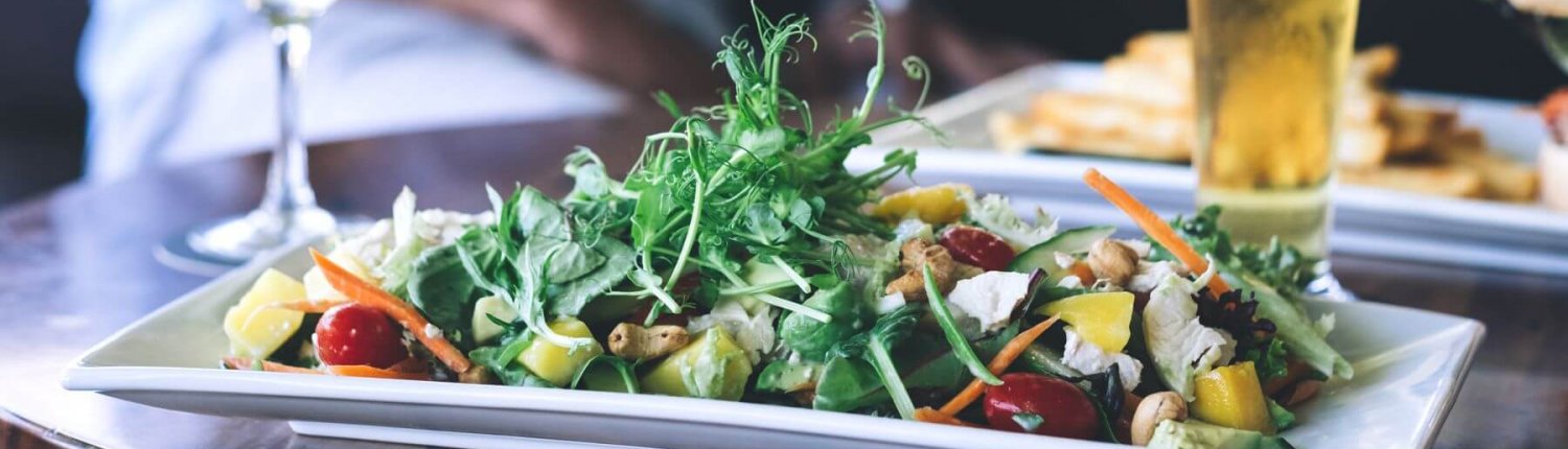 - Chicken with Quinoa & Roast Vegetable Salad (gf)26Chicken, quinoa, roasted seasonal vegetables, seeds, spices, herbs & honey mustard dressing